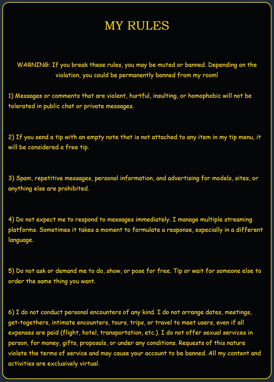 도기 스타일, 스팽킹, 가죽, 풋 페티시, 에로틱 댄스, 사정, 딥스로트, 스모킹, CEI(정액 먹기 교육), 핸드잡, 오르가즘, 자위, 섹스 기구